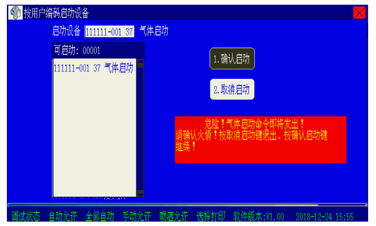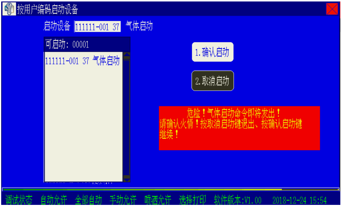 为防止对气体灭火设备的误操作,在按下对应手动键或在启动菜单下输入气体灭火设备的用户编码后,控制器屏幕自动发出两次提示。假定启动编码为 111111-021 号的气体灭火设备,屏幕提示如图 1 所示。